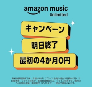 Amazon Music Unlimited 4か月無料キャンペーン(10/10まで)詳細はここをクリック>>